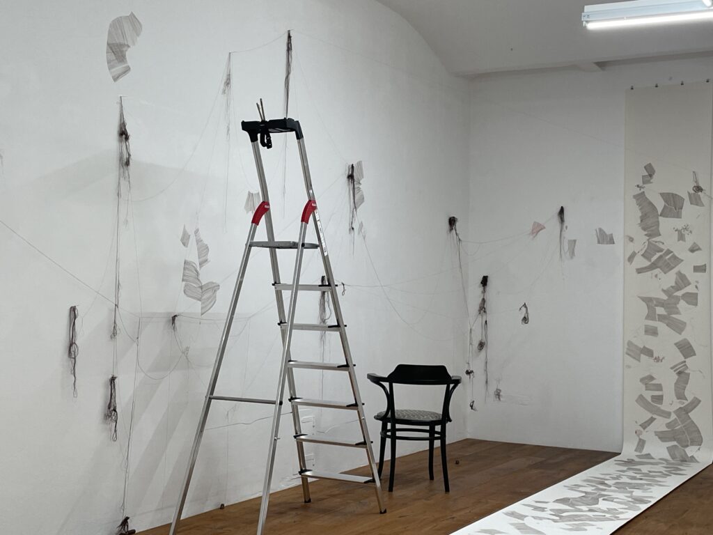Die Arbeit an der Raumzeichnung geht weiter: Anschließend an das Projekt “In den Raum gedreht” von 2025 geht Claudia-Maria Luenig nun einen Schritt weiter in den Raum. Anna Rudolf aus Amsterdam nähert sich im Raum mit ihren Methoden und Strategien der großen gestischen Kohle Zeichnungen auf Papierrollen der zeichnerischen Arbeit von Luenig.