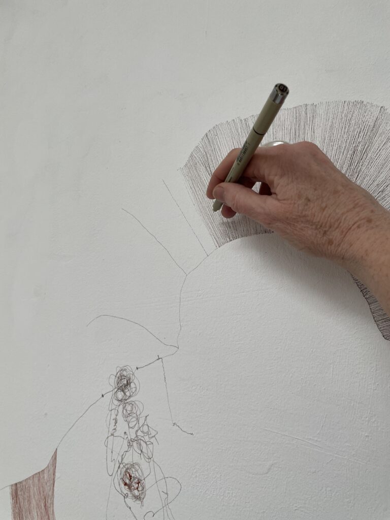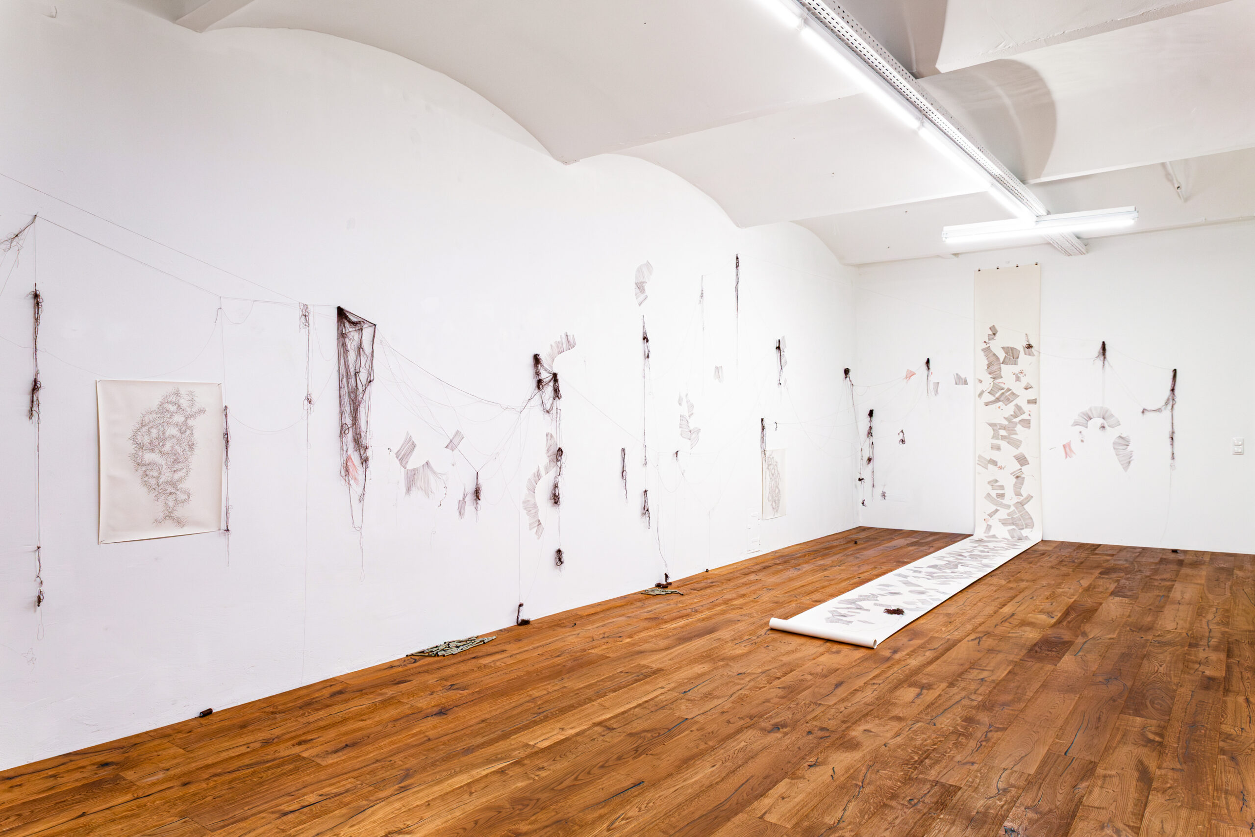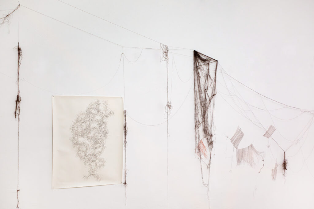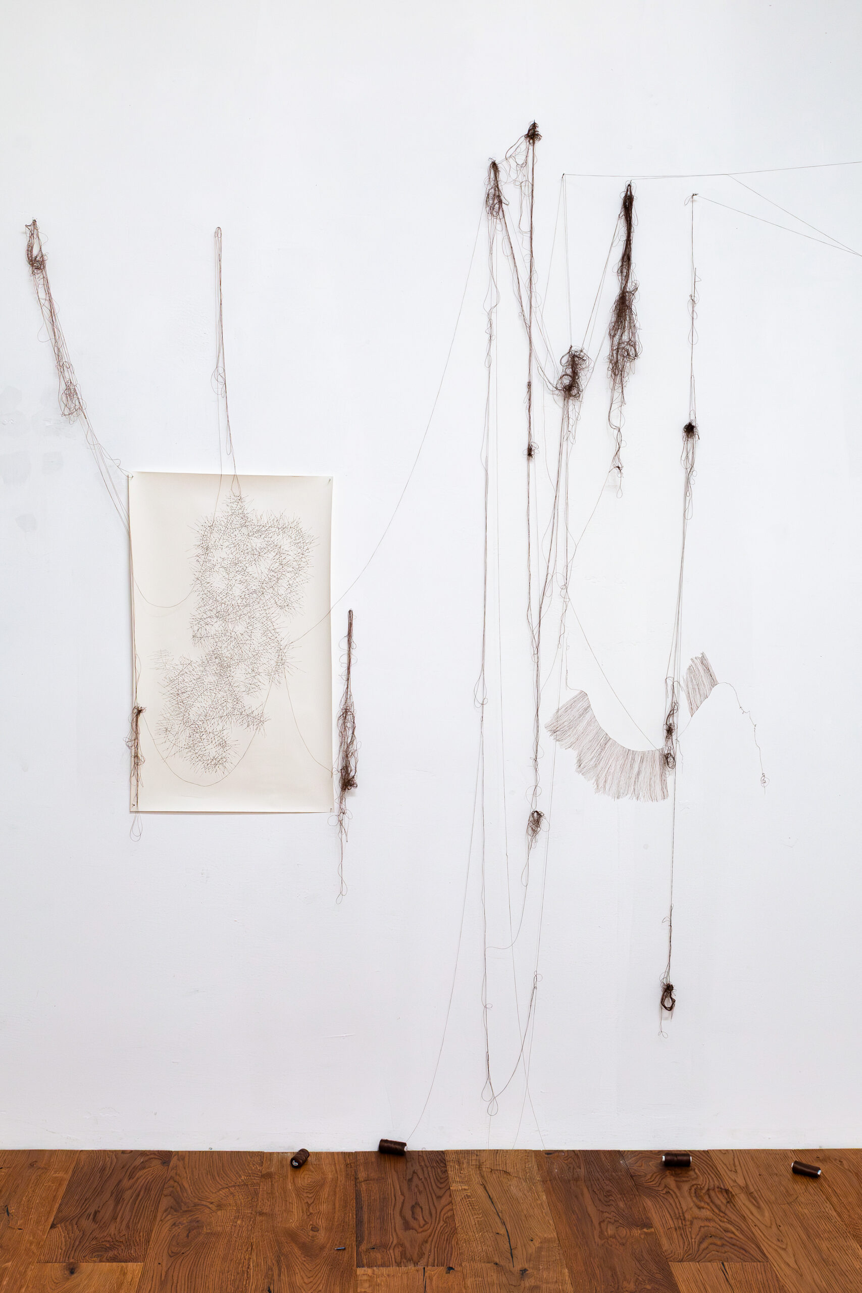 Ein Knäuel aus Fäden dient als Basis für die Zeichnung, die sich zum Zentrum hin entwickelt. Aus der Fadenkonstruktion entwickeln sich zufällig Linien, die sich ausbreiten, den Raum neu strukturieren und Körper umfassen.